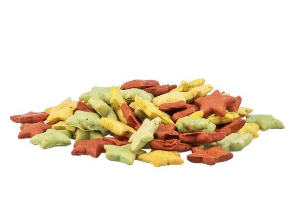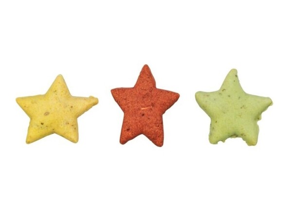 Malé křupavé sušenky ve tvaru hvězdiček s lososem, kuřecími játry a šantou kočičí, barveno přírodními barvivy: červená řepa, špenát a kurkuma, bez přidaného cukru, malá vánoční odměna pro všechny gurmány
